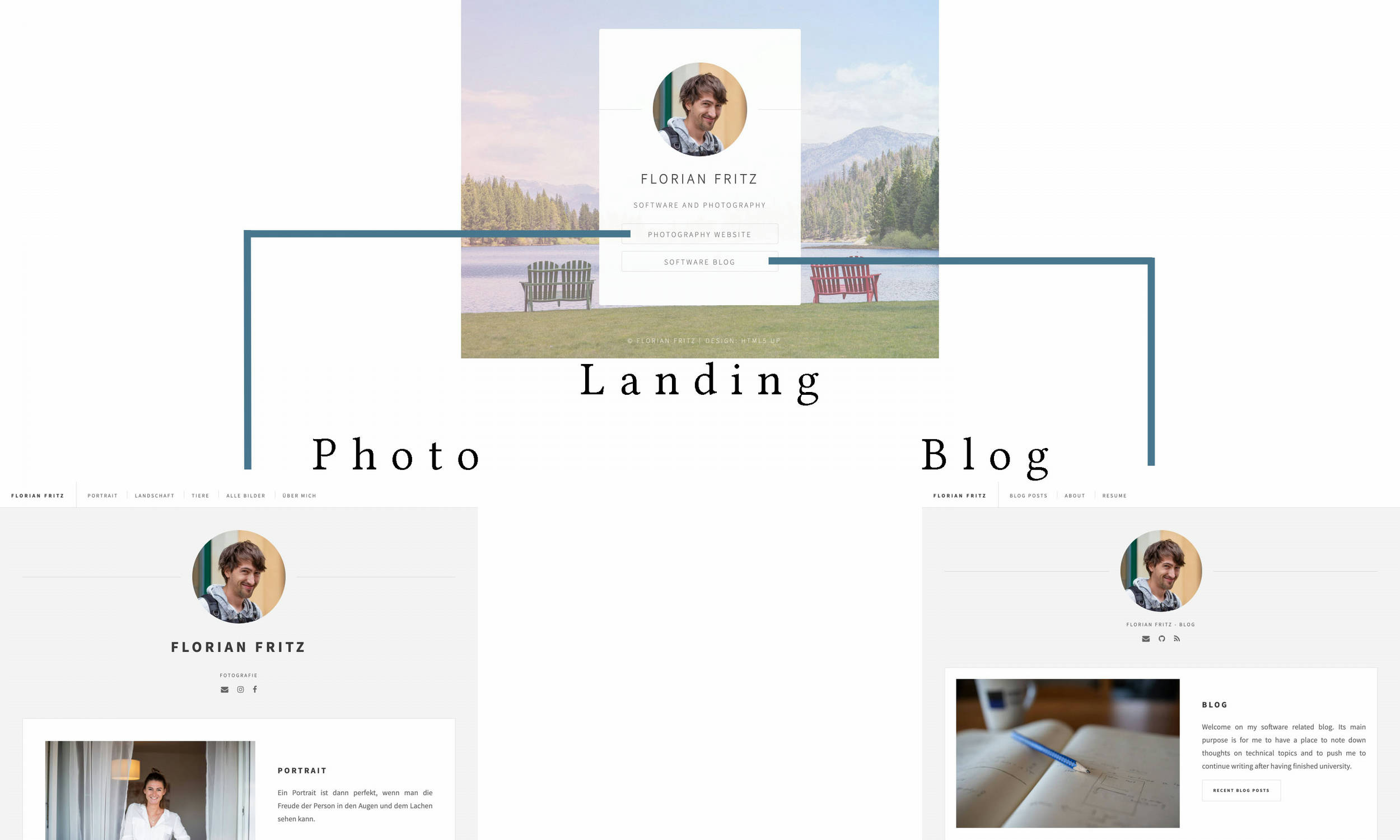 This led to the separation as shown in the image. A landing page is presented on the root domain florianfritz.net, redirecting visitors to either foto.florianfritz.net or blog.florianfritz.net. All three pages are completely separate, i.e. they do not directly share assets and are hosted self-contained on own subdomains. This allows me to customize them without affecting each other. I might for example want to host the blog on GitHub pages, but keep the photo site with big assets on netlify. Also, the layout of the photo portfolio and of the blog will likely diverge from each other with time.