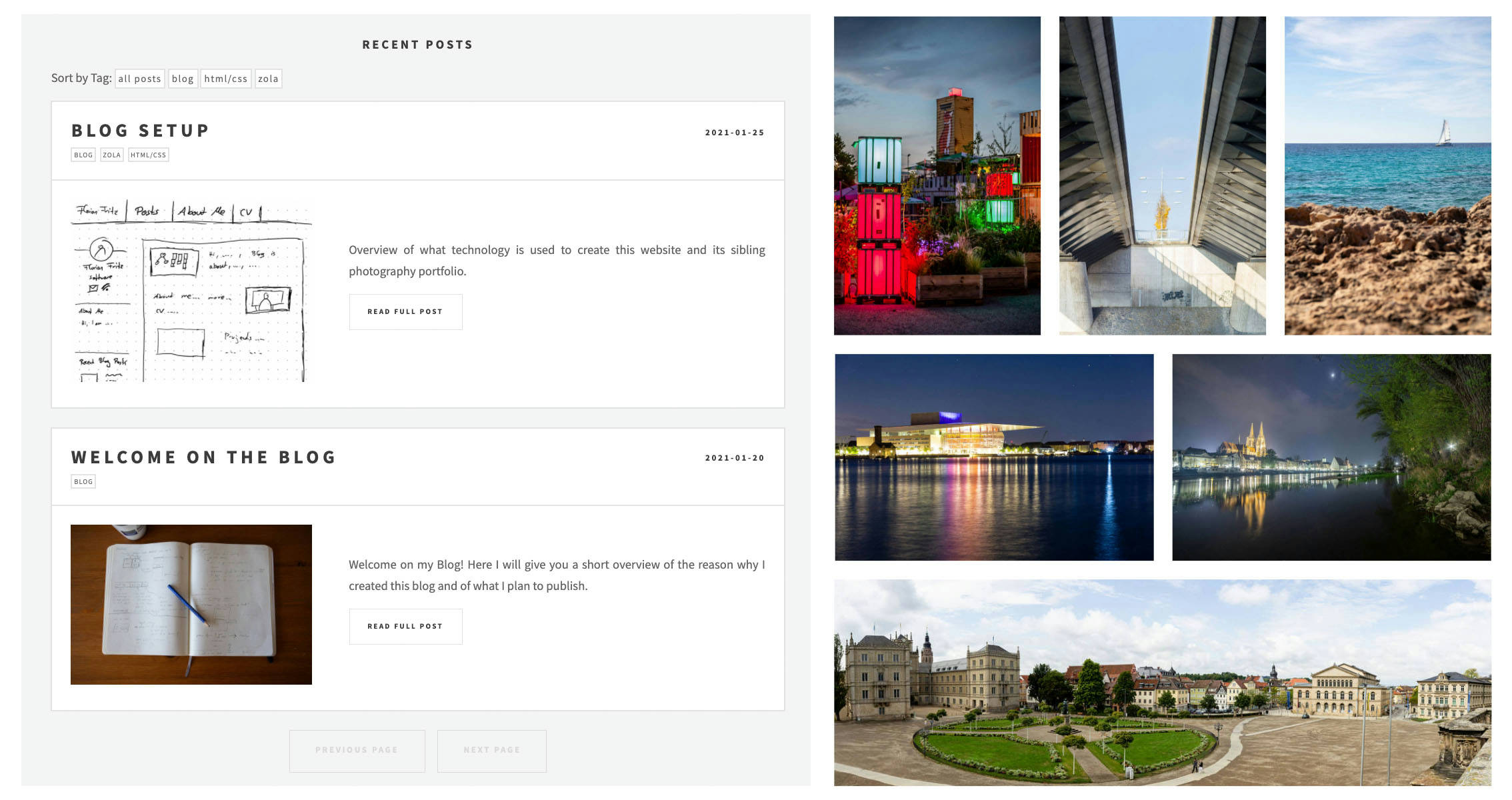 To highlight some of the divergences between the two sub-pages (photo and blog), you can see the tag system on the left side of the image below. For the software blog, I decided that it is important to filter by topic, as someone might for example be interested on all posts regarding C++. Thus, the blog post overview page and each individual post shows tags that you can click to filter for only matching posts.