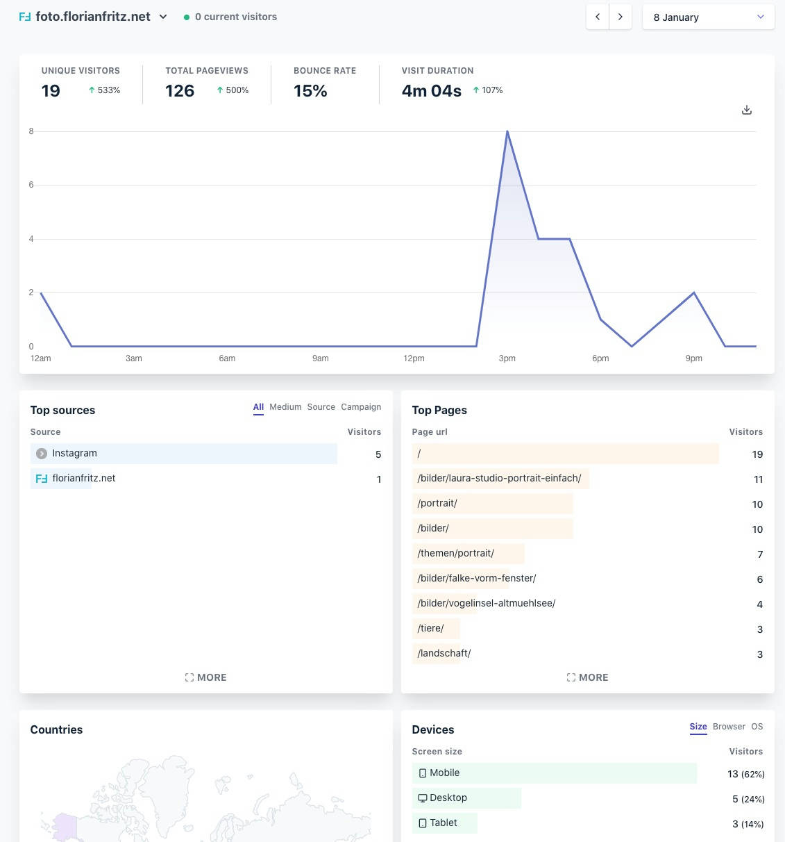 Adding it to the page is as simple as adding a single script to the HTML. What I really liked is their ability to use one of your own subdomains (for me stats.florianfritz.net) to serve this script. That way, you do not get blocked by most adblockers3. Overall, I am happy with the service and supporting its development with a few bucks seems fine.
