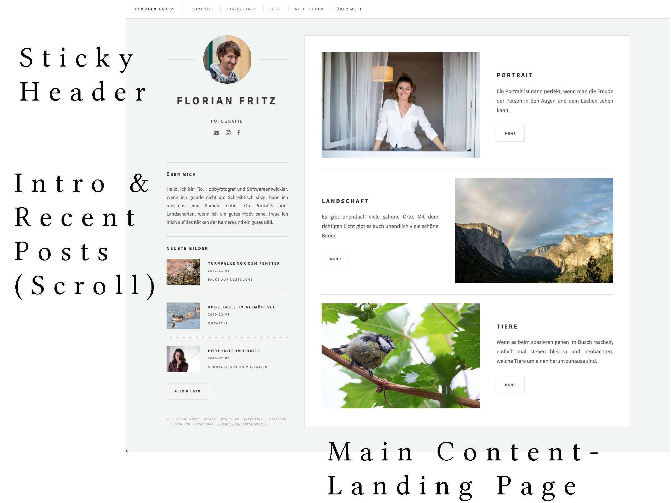 For the main future imperfect template, I needed to do some more modifications. It is designed to list recent posts on the landing page. However, especially for the photography site, I want to highlight my best work and only present recent posts as secondary content. Because of this, I reworked the landing page and added other, non-post related pages for individual highlights.